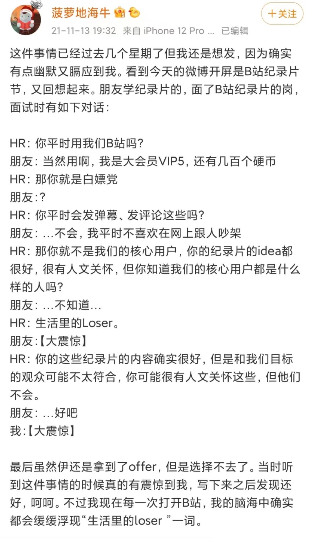 您現(xiàn)在的位置是: 首頁 > 求職知識 > 求職信 求職信 B站HR被辭退:亂說話的人,有多可怕? 2022-08-07 求職信 加入收藏 這是 HRGO | 人力資源分享匯 的第 2286 篇原創(chuàng)文章 ?HRGO新媒體編輯部 編輯-Sam 排版-阿正 校對-Josh昨天,B站又出幺蛾子了。網(wǎng)上曝出一條去年11月的消息,一位微博用戶的朋友在去B站面試的時候,被HR說成是白嫖黨;在聊到B站的核心用戶群體畫像,HR竟然說,B站核心用戶是生活里的Loser。HR說公司的用戶是Loser,這個話題足夠勁爆。這句話,讓好多人覺得又好氣又好笑。事件曝出的第一時間,B站立刻表態(tài)會內(nèi)部調(diào)查此事,現(xiàn)在也給出回應(yīng),該面試官去年年底已被勸退,會吸取教訓(xùn)加強(qiáng)管理,感謝監(jiān)督。雖然事情已經(jīng)過去大半年了,但仍然要引起HR們的警惕。01#從本質(zhì)上來說,這位HR是站在資本的角度在說話,也就是說。這位HR是站在誰給他發(fā)工資的角度,在說話。說一句扎心的話,在資本眼里,我們就是生活的Loser,就是被收割的韭菜,不管我們在平臺上什么樣,只要進(jìn)了平臺,就直接間接地給平臺創(chuàng)收了。而能在平臺上耗費大量時間的,應(yīng)該就是平時工作不是特別忙、有閑的人,大概率也不會是能解決大問題的人。再從另外一個角度說:如果這位HR是抱著騙人的心態(tài),想把小白以低工資拉到自己公司,根本沒必要打趣說什么白嫖黨,也沒必要告訴應(yīng)聘者真實情況。所以說,站在資本的角度上來講,這位HR是挺到位的,一切為資本發(fā)言。只不過,HR沒有管住自己的嘴巴,反而把我們用戶定位于Loser,又堂而皇之地告訴給了候選人,這就有點不太合理。02#HR既然是一家公司的門面,謹(jǐn)言慎行就是一個硬標(biāo)準(zhǔn)。已經(jīng)不知道有多少HR因為不好好說話被掛上熱搜,把HR群體的形象,越描越黑。就算HR本身沒什么壞心思,只是說話太直,一旦措辭不當(dāng),被抓住把柄,那就是跳進(jìn)黃河也洗不清。而且現(xiàn)在這個網(wǎng)絡(luò)環(huán)境,本身就有點嚴(yán)苛,正常說一句表達(dá)觀點的話,都恨不得要用十句話去解釋,何況直接罵人是Loser呢?與此同時,盡管大多數(shù)人也經(jīng)常自嘲自己是Loser,但是說話人一換,自嘲就是徹底的嘲諷,把這兩者混淆,的確是情商不過關(guān)。對于重視溝通表達(dá)的HR來說,也是基本功的不過關(guān)了。這么看來,這位HR在去年年底就被勸退,多少也是情有可原。所以,哪怕這位B站HR只是想和應(yīng)聘者好好交流用戶定位的問題,哪怕他真實想表達(dá)的意思是“失意者”,但措辭失誤,反而給面試者一種被侮辱的感受,也難怪應(yīng)聘者最后明明拿到了offer,也不愿意入職。單純因為溝通表達(dá)技巧不過關(guān),就白白錯失一個人才,太可惜了,太可惜了。03#回過頭來說,到底什么是Loser,誰是Loser?這個問題,很難回答。哪怕確實,現(xiàn)在糟糕的大環(huán)境下,大部分年輕人過得都不是很好。被裁員的、公司倒閉的、畢業(yè)即失業(yè)的,一抓一大把。時代的塵,落到每一個人身上都是一座山,貿(mào)然把這些不幸遭遇,歸結(jié)為“生活里的loser”,是連基本的尊重都沒有做到。類似的案例,也多次發(fā)生。之前小米的HR在招聘會上,也發(fā)表了歧視日語專業(yè)的應(yīng)屆生言論,聲稱要送對方從事電影行業(yè),被狠狠處罰。而對于Loser這個話題,誠然,有許多人是自己不思進(jìn)取,但以偏見的眼光看待全部、用暫時的失意定義人生的失敗,這樣的人,是不是也該被稱為Loser?小匯也相信,在不久的將來,現(xiàn)在失意的人,也會站起來繼續(xù)和這倒霉日子抗?fàn)帯?/span>歸根到底,誰是Loser,誰是Winner,事在人為罷了。希望所有HR都能從中獲得教訓(xùn),好好說話。延伸閱讀:面試中這5句話是雷區(qū),千萬別說!騰訊高管發(fā)言惹爭議:好好說話,真的是一門學(xué)問。每家公司,對人才的培養(yǎng)管理都事關(guān)重要,最后,也推薦你來學(xué)習(xí)《人才方案落地實操》,課程由原萬達(dá)、碧桂園高管:何欣老師,親自設(shè)計,全程免費復(fù)訓(xùn),保證課后方案可落地,內(nèi)容可復(fù)用。內(nèi)部名額,掃碼咨詢▼點擊閱讀原文↙咨詢報名課程 掃描關(guān)注微信公眾號,第一時間獲取網(wǎng)站最新動態(tài) 轉(zhuǎn)載請說明來源于"邯鄲英才網(wǎng)" 本文地址:http://m.51tyzc.com/qiuzhixin/20036.html 上一篇 很貴的HRBP,都靠這18個字 下一篇 不會面試的HR,被候選人拉黑了都不知道。 相關(guān)文章 文章評論