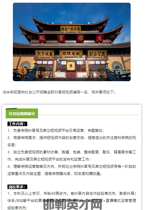 這兩天光速上熱搜又光速刪推送的法華寺,其實兩年前的7月份就發(fā)布過一則招聘啟事,向社會公開招聘一名全職抖音短視頻編導,一經(jīng)錄用,工資10000元/月,正經(jīng)簽合同繳社保,官方指導明碼標價,不給中間商賺流量的機會。