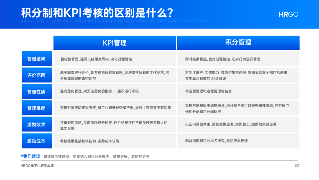 您現(xiàn)在的位置是: 首頁 > 人才招聘 > 招聘運營 招聘運營 別等員工被挖走了,才知道什么是積分制! 2022-08-07 招聘運營 加入收藏 最近,不少行業(yè)的HR都在反應(yīng):人員流動率太高了!員工干得不開心,就很容易跳槽、離職。這時,如何設(shè)計出一套好的激勵方案,讓人才愿意留下來就至關(guān)重要了。 說到留人,很多HR第一時間想到的就是:加錢!用高薪留人。想象很豐滿,現(xiàn)實卻很骨干,給了高薪,人力成本上去了,最后那些想走的人最終還是走了。所以,只是用錢去留人,正變得越來越乏力了。但傳統(tǒng)的激勵工具,都有點不太給力,我們亟需一套能夠解決這些問題的工具:福利待遇一刀切;制度執(zhí)行、人力資源內(nèi)耗嚴(yán)重;各種待遇大鍋飯,沒能調(diào)動員工積極性;暗箱操作,一個紅包調(diào)動一個人的積極性,卻影響一大片人的積極性;……這次給大家推薦的《激活組織的積分制實操班》,就能夠幫助大家解決這些問題。或許你已經(jīng)聽聞過「積分制管理」,只不過一直沒有機會系統(tǒng)學(xué)習(xí),也不知道如何真正落地,現(xiàn)在機會來了!掃碼咨詢,了解詳情▼01為什么推薦積分制管理真正的管理工作,會不斷遇到這樣的問題:制度做好了,但是沒人執(zhí)行;有企業(yè)文化,員工卻不買賬;員工要加薪,否則就要離職;原本想激勵員工,但花了錢他們卻不樂意;評定晉升和加薪的人選,一直沒辦法確定;有獎金但是沒動力,沒獎金人就直接跑了... ...其實這些大家很頭疼的問題,用積分制就能解決,而積分制和KPI考核最大的不同,如下圖,點擊放大更清晰:02游戲化積分提升員工自驅(qū)力要知道,人搞不定,事就辦不成,解決了人的問題,就解決了企業(yè)80%的管理問題。積分制管理的作用,正是通過扣分、加分、獎金三種方式,實現(xiàn)即時管理,給員工傳遞以正向激勵為主,負(fù)向激勵為輔。 用獎的方式替代罰的效果,員工認(rèn)同度高,七分激勵,三分管理,在“態(tài)度”與“能力”之間強化“意愿”,變“要我做”成為“我要做”。另外,積分還具有強大的包容性,能夠和任何管理制度對接。我們特別建議,將績效考核過程、結(jié)果納入到積分管理中去,那樣的效果更好、激勵更強。03積分制專家面對面授課答疑譚老師是著名的激活員工實戰(zhàn)專家,同時是積分制管理資深咨詢師,擁有20年大型上市企業(yè)管理經(jīng)驗。譚老師也是與HRGO合作多年的老師了,授課人數(shù)也多達(dá)上百人,專業(yè)能力完全可信賴。作為一個實戰(zhàn)派的老師,譚老師十分擅長企業(yè)內(nèi)部員工激勵、股權(quán)激勵、積分制管理和新型績效等方式來激活員工。掃碼咨詢,了解詳情▼向左滑,查看課程大綱(可點擊查看大圖) 掃描關(guān)注微信公眾號,第一時間獲取網(wǎng)站最新動態(tài) 轉(zhuǎn)載請說明來源于"邯鄲英才網(wǎng)" 本文地址:http://m.51tyzc.com/zhiyeguihua/20056.html 上一篇 工資在1萬以下的HR,你們將面對更殘酷的現(xiàn)實了! 下一篇 內(nèi)向性格的7大優(yōu)勢,99%的HR都不知道 相關(guān)文章 文章評論