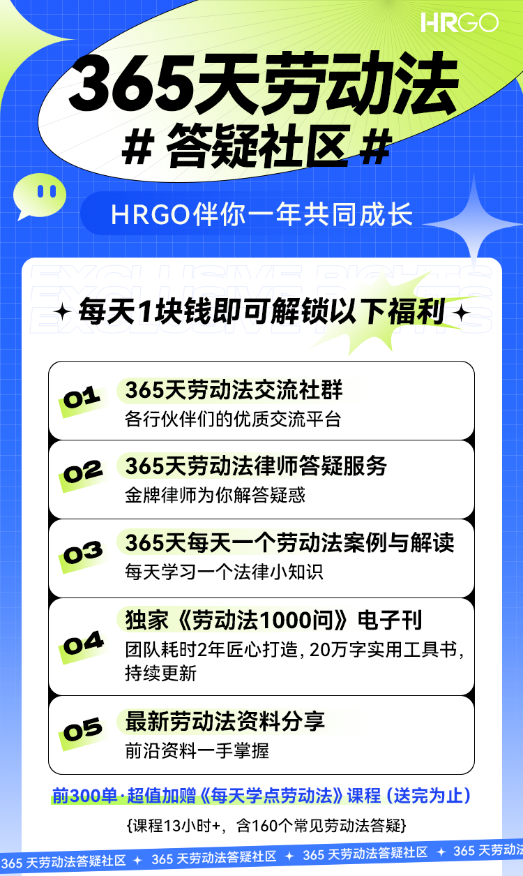 現(xiàn)在就推薦你《365天勞動(dòng)法答疑社區(qū)》,每天僅需1塊錢,全年享受專業(yè)勞動(dòng)法律師咨詢答疑服務(wù)。